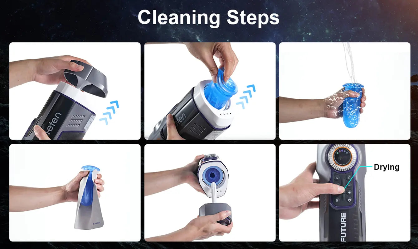 Material: Die abnehmbare Silikonhülle besteht aus hochwertigen Materialien, die Langlebigkeit und einfache Reinigung gewährleisten. Sie ist auch wasserdicht nach IPX7, für ein sorgenfreies Erlebnis. Das Gerät wird mit einer trockenen und warmen Basis geliefert, die die Hüllen schnell aufheizt und trocknet, um Sauberkeit und einfache Wartung im Laufe der Zeit zu gewährleisten.
