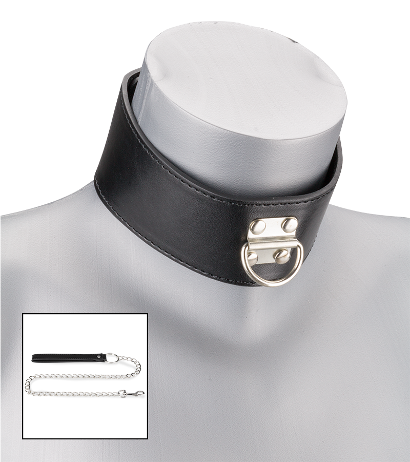 Das SM-Halsband mit D-Ring ist aus schwarzem Kunstleder gefertigt. Es ist größenverstellbar und passt sich an. Auf der Innenseite, die direkt am Hals anliegt, ist das Halsband mit einem weichen Stoff gefüttert, sodass ein optimaler Tragekomfort garantiert wird. Im Lieferumfang ist ein Schloss enthalten. Sie erhalten zwei Schlüssel dazu, mit denen Sie das Halsband mit dem Schloss abschließen können. Am besten heben Sie einen der beiden Schlüssel an einem sicheren Ort auf. Vorne am Halsband befindet sich ein silberfarbener D-Ring, an dem Sie die mitgelieferte Leine befestigen können. Die Leine hat eine Länge von 78,5 cm und besteht aus einer Metallkette und einer Halteschlaufe aus schwarzem Kunstleder.
