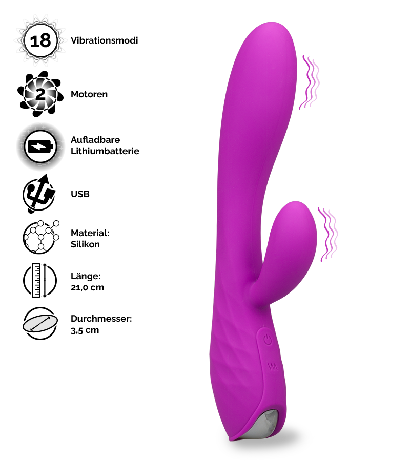 Der Vibrator mit der weichen Oberfläche und dem nachgiebigen Schaft ist superflexibel, sodass er sich sehr gut an Ihren Körper anpassen kann. Der Klitorisreizer legt sich ganz sanft von außen auf Klitoris und Schamlippen. Schaft und Klitorisreizer sind je mit einem eigenen Motor ausgestattet, sodass Sie die Vibrationen unabhängig voneinander steuern können. Die Vibrationsfunktion kann in 9 unterschiedlichen Modi verwendet werden.