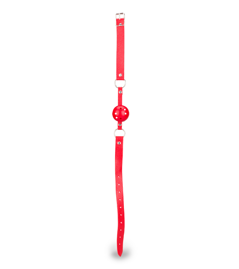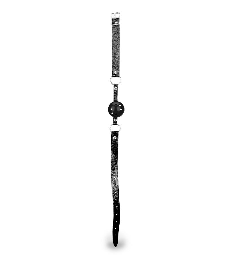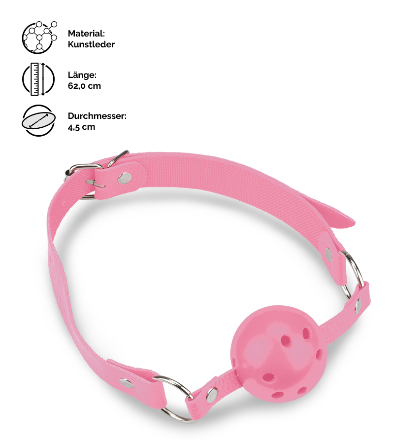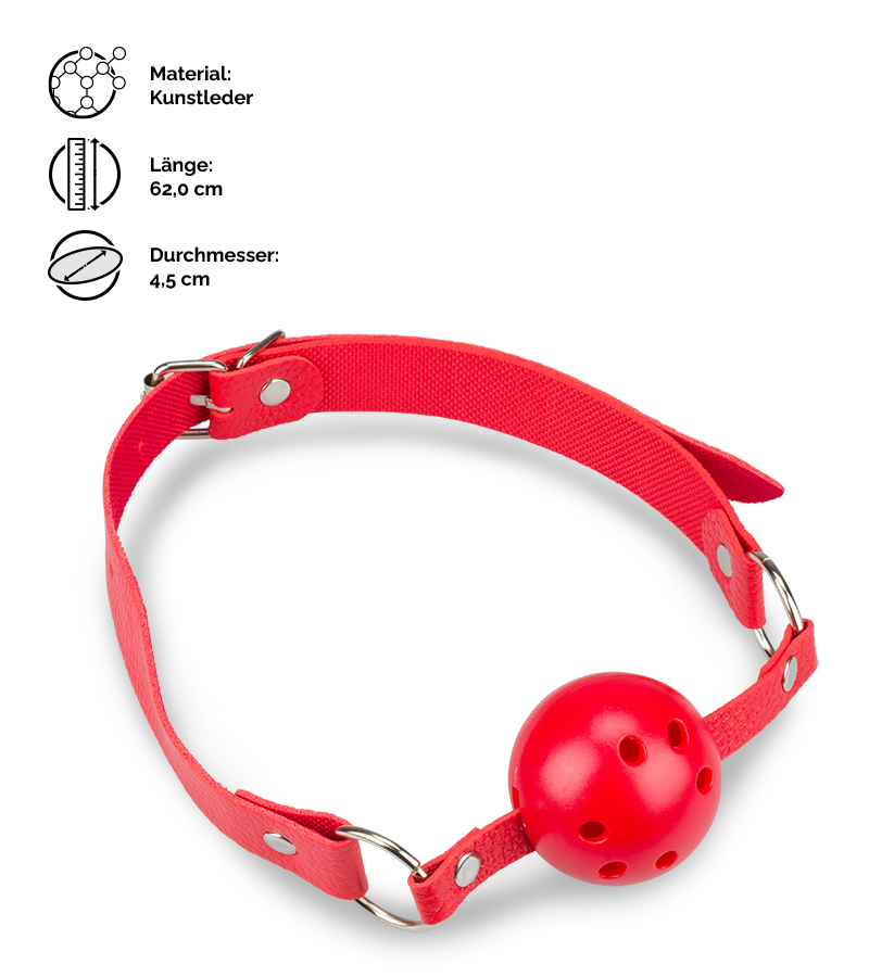 Der Knebel besteht aus einem Kopfgurt aus Kunstleder mit einer Gesamtlänge von 62 cm und einem Ballknebel mit einem Durchmesser von 4,5 cm. Die Person, der Sie den Ballknebel anlegen, kann nicht mehr sprechen und muss sich damit begnügen, die Befehle des dominierenden Parts zu befolgen. Keine Panik: Der Ballknebel verfügt über 12 kleine Luftlöcher, durch die Sie ganz leicht atmen können. Der SM-Ballknebel mit Luftlöchern ist ein sehr solides SM-Sextoy, das Ihre BDSM-Session um neue Lusterfahrungen reicher macht.