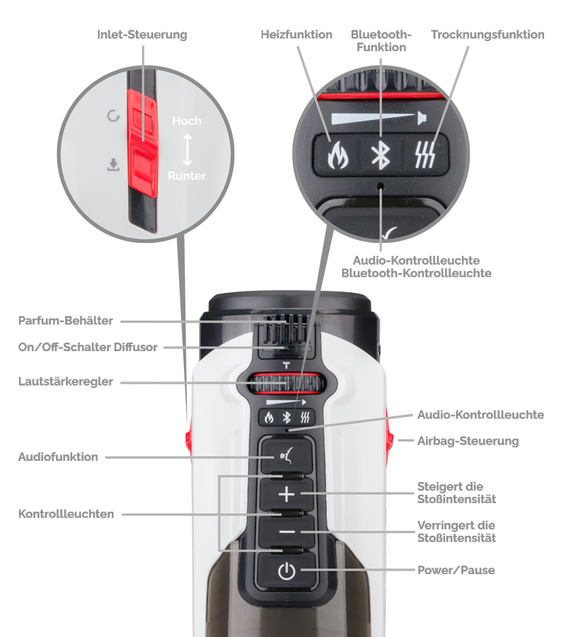 9. Auf der rechten Seite befindet sich die Taste zum Ein- und Ausschalten der Airbag-Funktion. Wenn Sie die Taste nach unten drücken, zieht sich das Inlet zusammen. Wenn Sie die Taste nach oben drücken, wird der Druck abgelassen.
