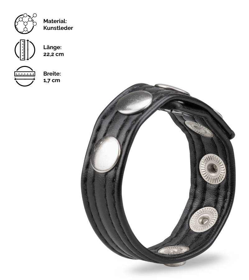 Der Penisring aus Kunstleder sieht mit seinen vier Druckknöpfen aus wie ein kleiner Gürtel. Dank der Druckknöpfe können Sie den Durchmesser des Penisrings individuell festlegen. Befestigen Sie den Penisring einfach hinter den Hoden und lassen Sie sich von der Wirkung überraschen, die der kleine Ring auf Ihre Erektion hat. Durch das feste Material, das nicht nachgibt, wird die Erektion härter und Sie haben eine bessere Ausdauer.