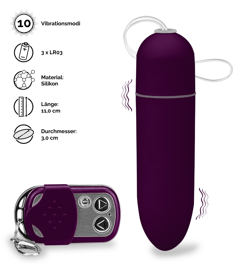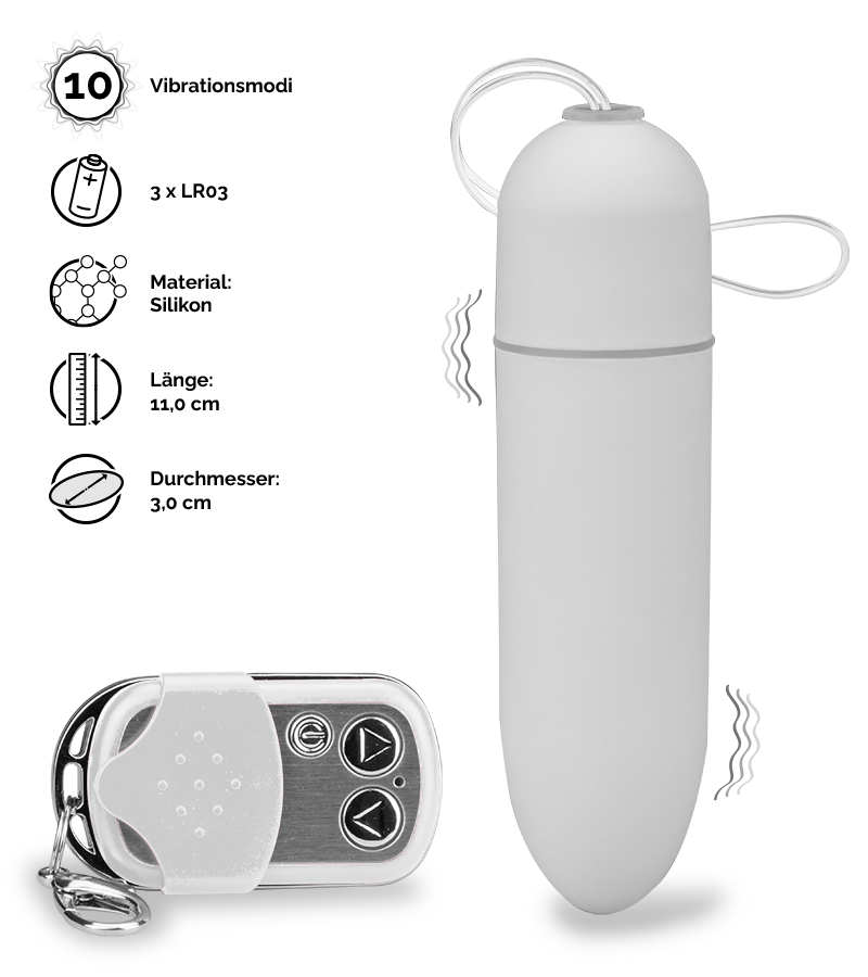 Dieses Vibroei ist ein Modell in XXL. Es schenkt Ihnen kraftvolle und tiefe Intimmassagen. Die 10 verfügbaren Vibrationsmodi können über eine kabellose Fernbedienung aktiviert und ausgewählt werden. Für lustvolle Experimente auch außer Haus überlassen Sie die Funkfernbedienung einfach Ihrem Partner oder Ihrer Partnerin.